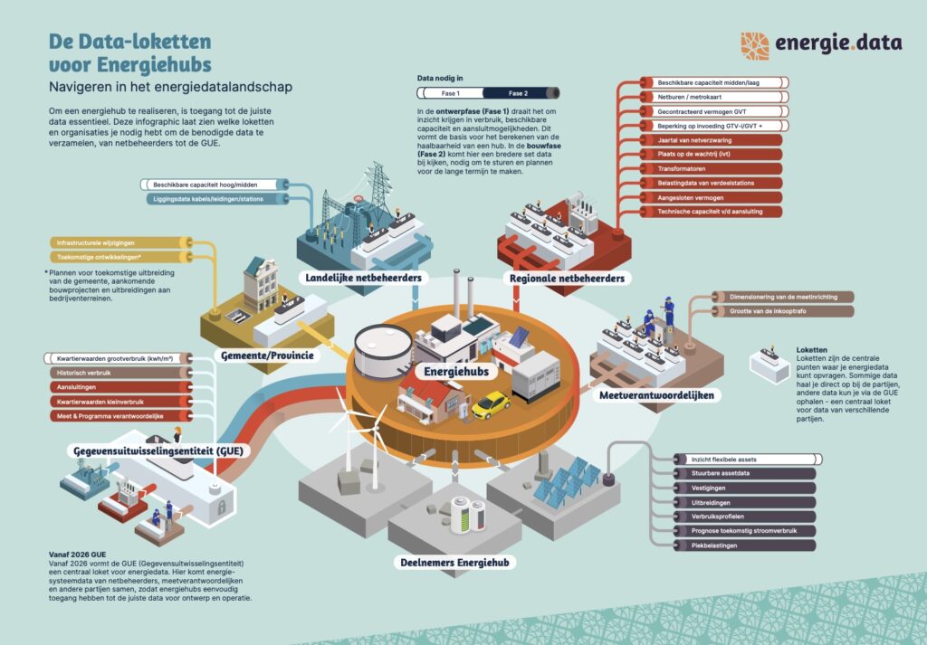 Om een energiehub te realiseren, is toegang tot de juiste data essentieel. Bijgaande infographic laat zien welke loketten en organisaties je nodig hebt om de benodigde data te verzamelen, van netbeheerders tot de GUE.